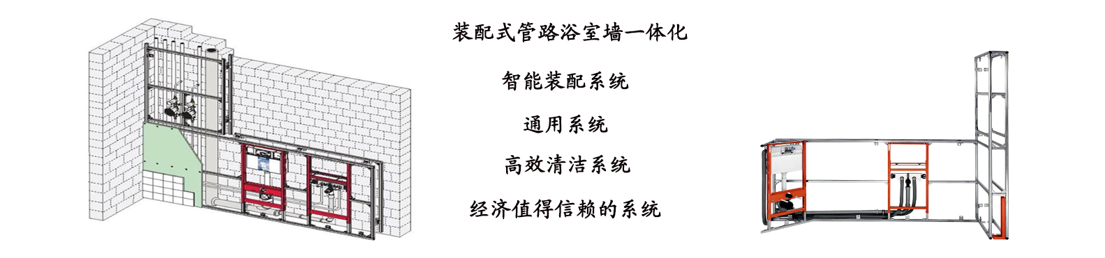通過智能連接附件,除了組合成百變快裝墻,無論是安裝壁掛馬桶、洗臉盆、小便斗或